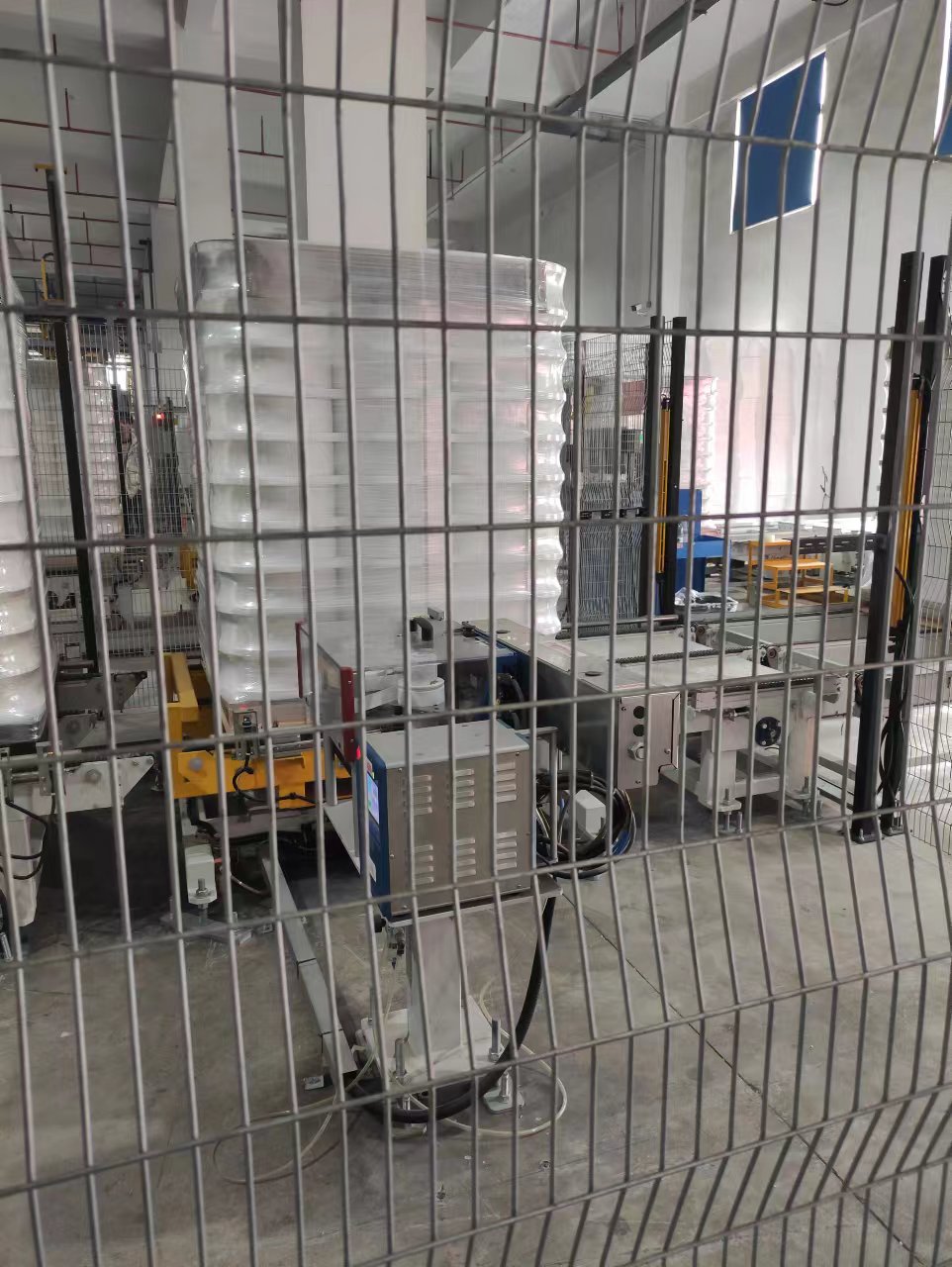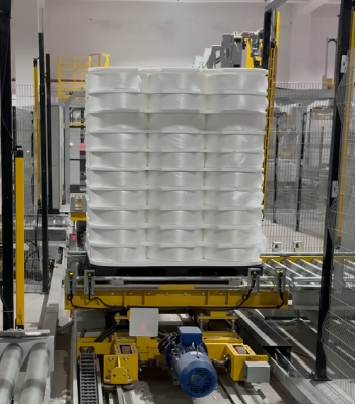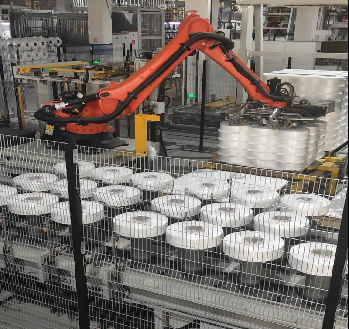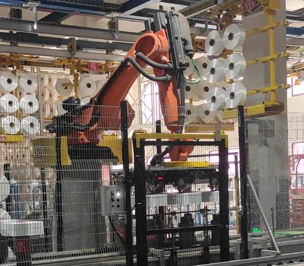 4.堆垛機(jī)械手將傳送帶上等待堆垛的絲餅盤上的絲餅抓起并放在木托盤上,隔板機(jī)依層放隔板,根據(jù)要求層數(shù)完成堆垛工序。