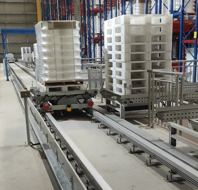 3.木架機(jī)放置泡沫隔板至木托盤上,并通過傳送帶將木托盤輸送到堆垛等待位。